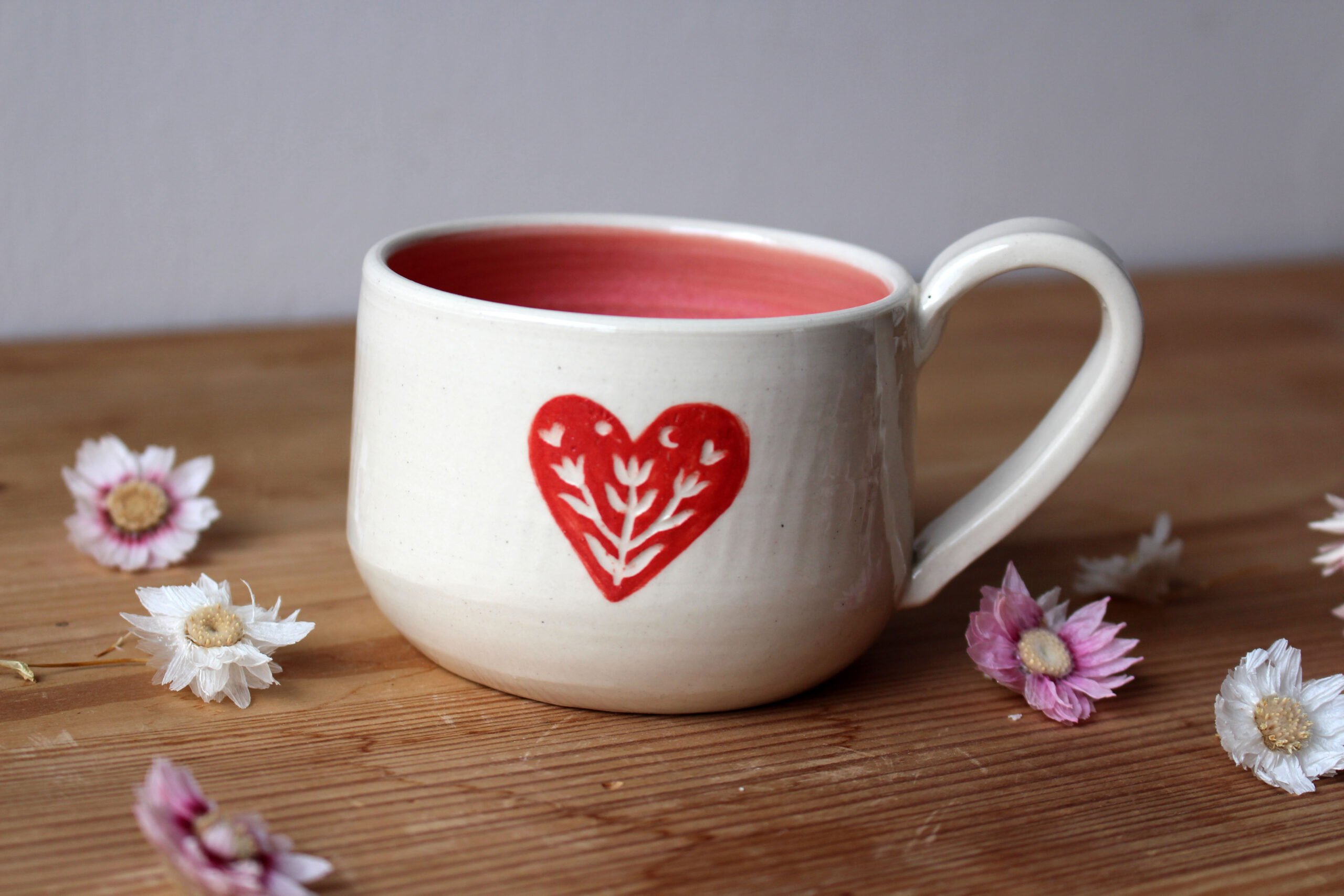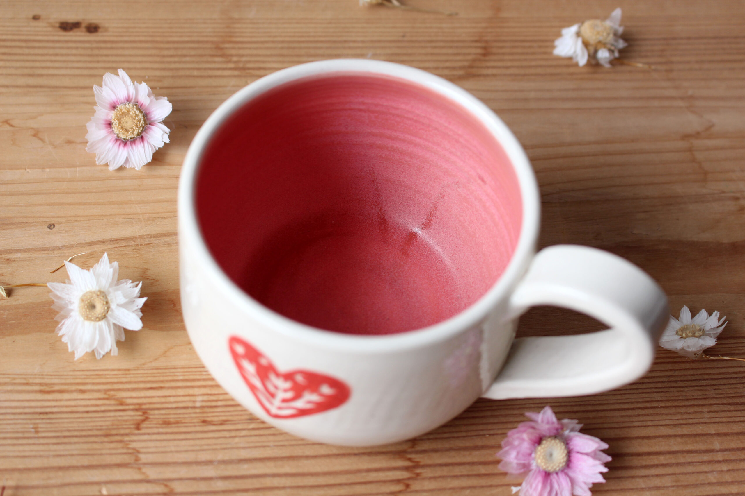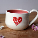 A csésze belsejét rózsaszín máz borítja, külső részét egy oldalán kézzel mintázott és festett tulipános szív motívum díszíti.
